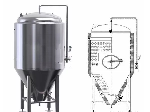 发酵罐的一个主要作用是发酵——从麦汁到成熟的啤酒的一个过程。所以对于温度控制有相当严格的要求。一个好的发酵罐设计,首先需要考虑到温控系统。对于温控系统发酵罐的基本构造一般情况下分为四层,最里面是内胆,中间是通冷媒的夹套,夹套和内胆直接相连,胶套外面是发泡保温层,保温层外面就是我们看到的发酵罐外壁。冷媒通过向夹套内通进行循环来实现温度控制。故夹套的面积多少影响温控效果。不管是是盘管、米勒扳、夹套式等换热面积最重要。另外保温层的厚度以及保温层里面打的发泡的均匀性很重要(夏天发酵罐发汗,就是保温层没有做好,引起来的)这样不但节能,并且温度比较容易控制。